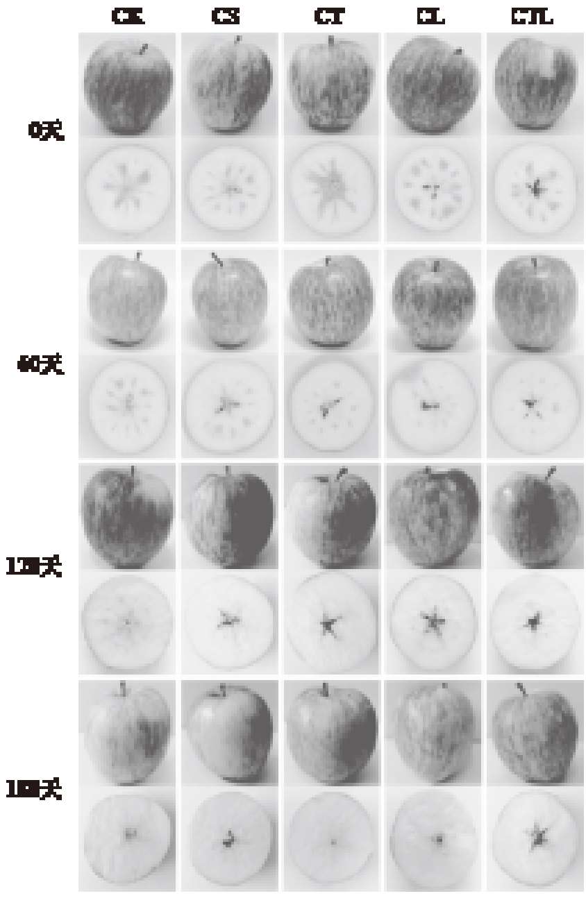 从图2-10可以看出,第180天时,对照组的全果外观皱缩,半果果芯褐变。而涂膜的四组苹果基本没有出现外观的皱缩或果芯的褐变现象。结果表明,四种涂膜液可以有效提高苹果的外观质量和减少果芯的褐变。