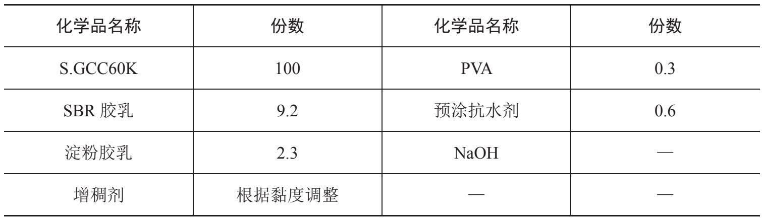 向高速分散机料筒中加入60级浆钙,加入NaOH调节颜料pH值,低速(500r/min)搅拌下加入SBR胶乳和自制淀粉胶乳,并加入PVA,高速(1200r/min)分散均匀,低速(300r/min)搅拌下加入抗水剂,并加入水使涂布液达到一定浓度,慢慢加入一定量的增稠剂使之达到一定的黏度,搅拌均匀后出料。测试涂布液性能,并选用2#涂布辊对纸张进行定量涂布,涂布量13±1g·m -2 ,并在105℃烘箱中干燥2min。