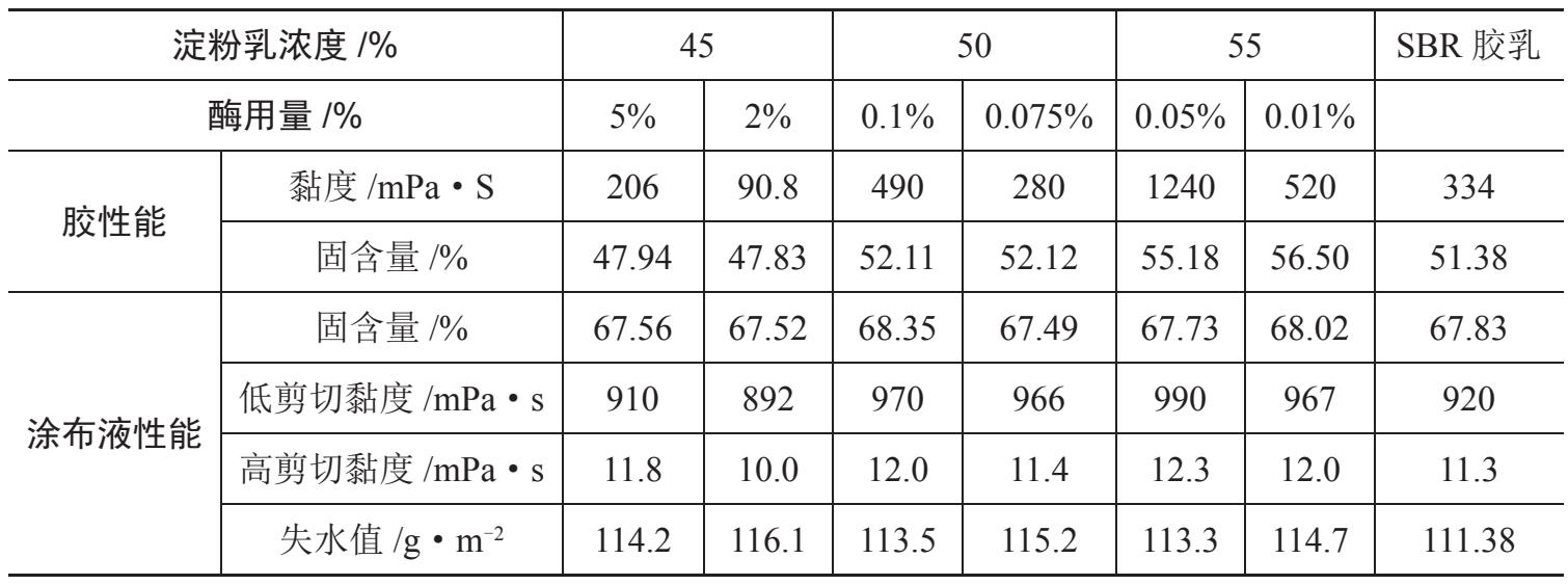 表3-4 淀粉乳浓度对胶乳及涂布液的影响