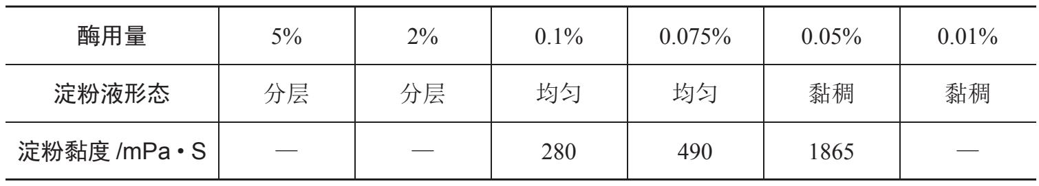 如表3-3所示,随着α-淀粉酶用量的增加,淀粉胶乳黏度降低。酶用量过大时,切断作用强烈,作用于直链淀粉,主要生成麦芽糖,可溶于水,而分解支链淀粉时,除生成麦芽糖、葡萄糖外,还生成分支部分具有 α -1,6-键的 α -极限糊精,不可进一步分解,造成分层现象;淀粉酶用量过小,淀粉链切断不充分,黏度大,不适合做胶黏剂。 α -淀粉酶用量为0.1%和0.075%时,酶解淀粉胶乳形态均匀,黏度适合,符合纸张涂布胶黏剂要求。