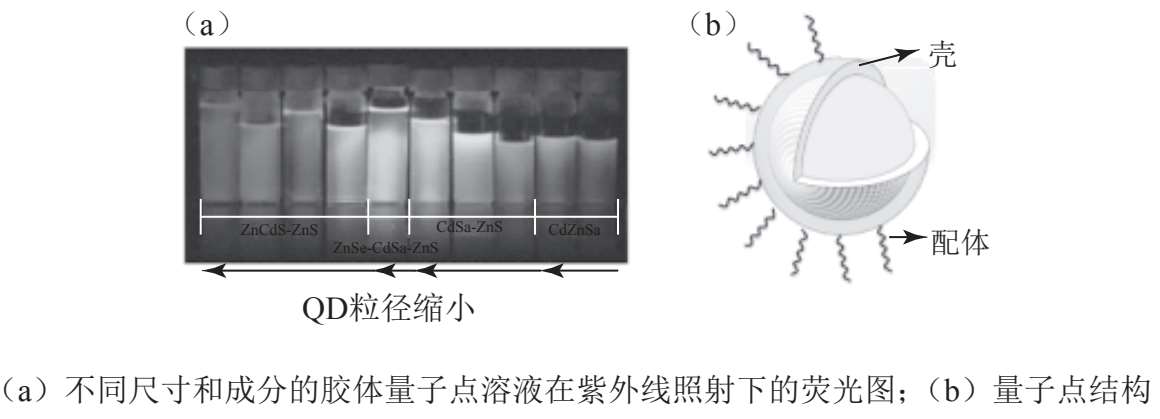 胶体量子点(Colloidal Quantum Dots,CQD)是一种半导体纳米晶体,其尺寸在2~20nm,是三维尺寸都处在纳米量级的新型无机半导体材料。由Ⅲ -Ⅴ族(GaN,InP,GaAs等)和Ⅱ -Ⅵ族(CdSe,CdS,ZnS等)半导体材料组成,具有很强的量子限域效应,可以导致量子点能级发生量子化,因此改变量子点的粒径大小就可以改变其发射波长,如图1-13所示。