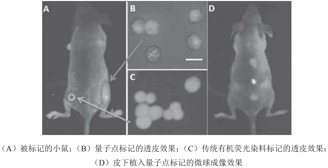 对量子点表面进行生物功能化处理,可以实现量子点在生物成像、荧光检测等领域的应用,使得以量子点技术为支撑的细胞标记技术得到迅速发展,通过荧光标记,从而使得癌细胞等特殊细胞易于观察。Nie等人成功制备了一类量子点荧光探针,并设计在小鼠体内植入人体前列腺肿瘤细胞,最后通过将该荧光纳米探针注入小鼠体内验证了量子点在活体内部肿瘤细胞显像具有可行性,如图1-15所示。