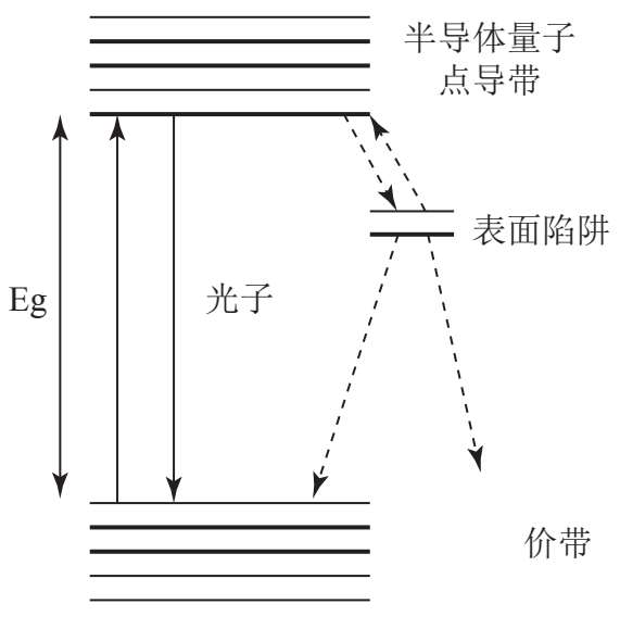 量子点荧光材料,受到光或电的激发后,价带中的部分电子会越过禁带进入能量较高的导带,这一跃迁过程类似于分子化学中的电子从最高占据分子轨道(HOMO)跃迁至最低未占分子轨道(LUMO)现象。处在高价态的电子会因为不稳定而回到它的基态,并同时发出能量,从而产生荧光,如图1-12所示。量子点的荧光量子产率主要受表面态的影响,大量表面缺陷的存在降低了量子点的荧光量子产率。因此,可以通过选择合适的配体对量子点的表面进行修饰或者在量子点的表面包覆一层具有更宽禁带宽度的无机材料来减少或者消除量子点的表面缺陷,形成核壳量子点。常用的壳材料有CdS、ZnS、ZnSe。宽带隙壳不仅能钝化芯表面的悬浮键,而且能将光生载流子限制在芯表面,降低了光生载流子被表面缺陷捕获的可能性。因此,核壳结构提高了荧光效率,防止了量子点的化学腐蚀和光氧化,提高了量子点的稳定性,并且它们还具有较长的光致发光(PL)寿命和抗光漂白性能。