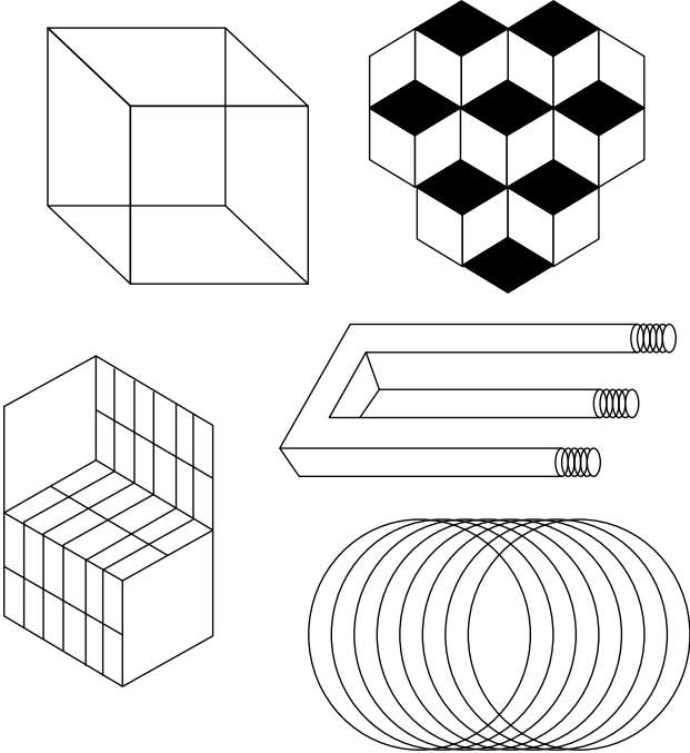 在平面上绘制立体图形,可能出现深度不明确的图形,会感受到图形的前后或上下深度的倒转,如图3-14所示,这种视错觉即深度错觉。