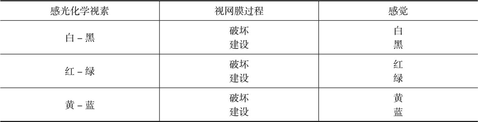 光刺激破坏白-黑视素,引起神经活动,产生白色感觉;无光刺激时,白-黑视素便重新建设起来,所引起的活动产生黑色的感觉。同理,对红-绿视素:红光起破坏作用,绿光起建设作用;对于黄-蓝视素:黄光起破坏作用,蓝光起建设作用,如表3-2所示。
