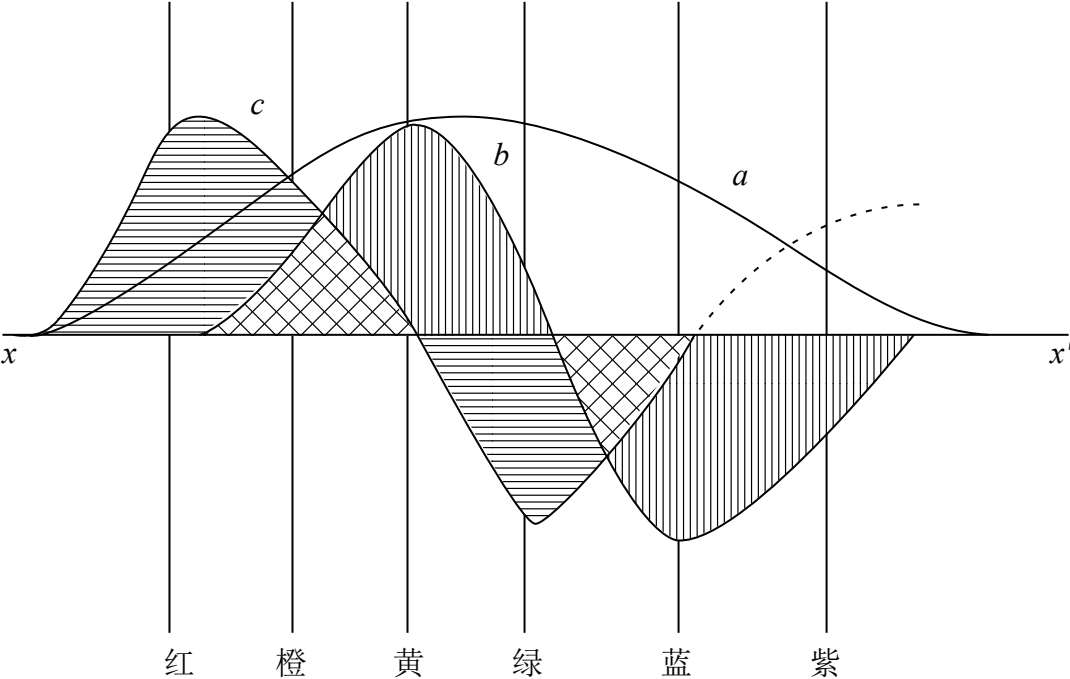 三对视素的代谢作用,如图3-9所示。 x — x ′轴线以上是破坏作用,以下是建设作用。曲线 a 是白-黑视素的代谢作用;曲线 b 是黄-蓝视素的代谢作用,曲线 c 是红-绿视素的代谢作用。曲线 a 的形状表明了光谱饱和色的亮度成分,它在黄绿处最高,说明了黄绿色是光谱上最明亮的颜色。