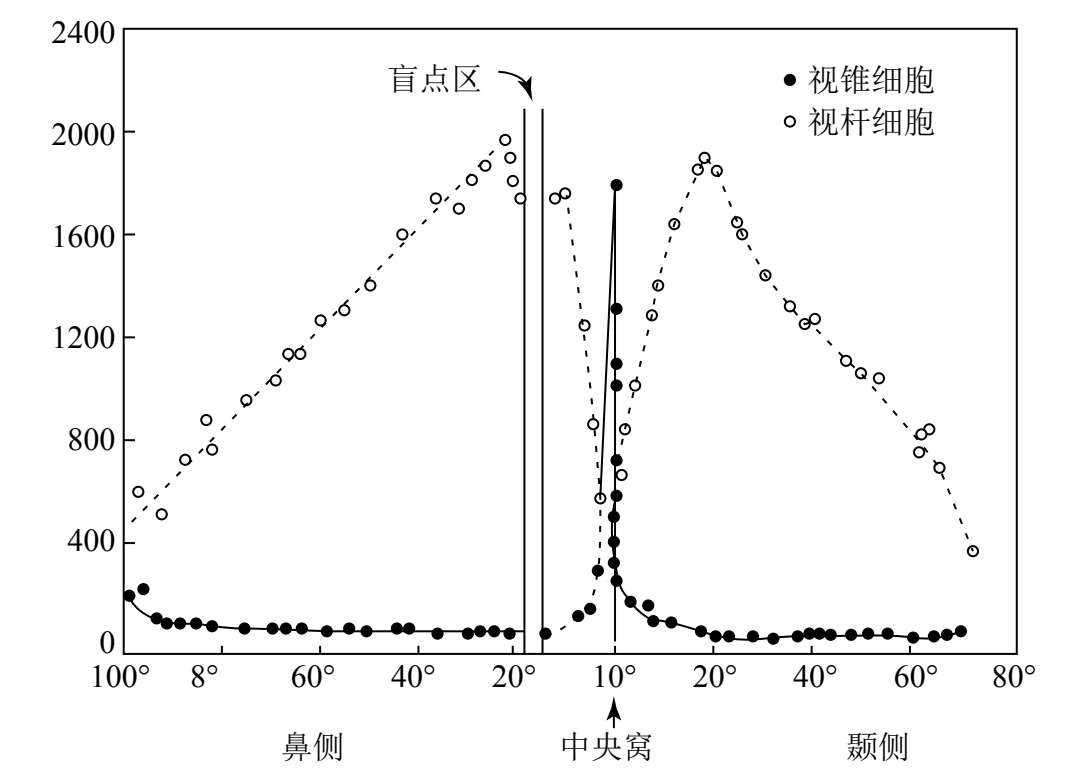 图3-4 视网膜上的杆体细胞和锥体细胞的分布