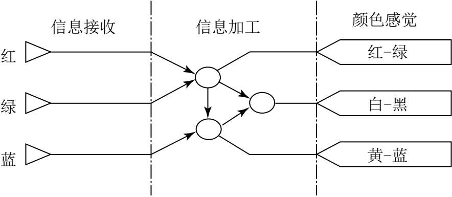 这四种对立的感光细胞很符合赫林的四色学说。因此可以认为:在视网膜上的锥体细胞是一个三色机制,视觉信息在大脑皮层视区的传导通路中变化成四色机制,如图3-11所示。