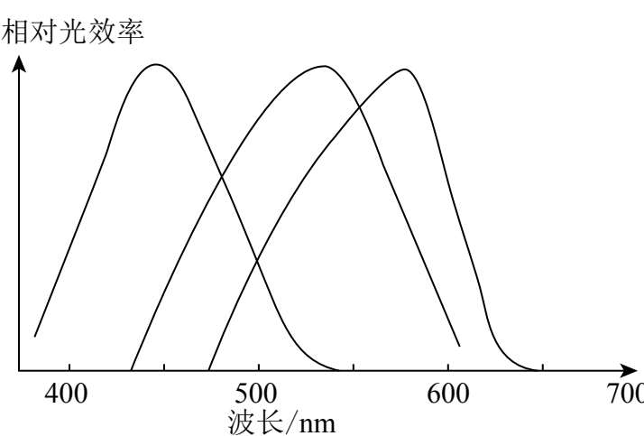 现代视觉生理学发现,在视网膜中确实存在三种不同颜色的感受器,即感受蓝光的锥体细胞、感受绿光的锥体细胞和感受红光的锥体细胞。每种锥体细胞具有不同的光谱敏感特征,如图3-10所示。上述的发现有力地支持了三色学说。