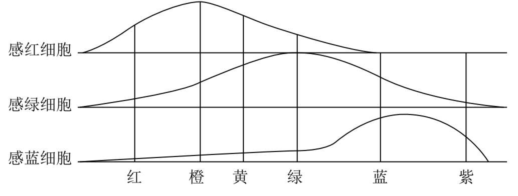 对光谱的每一波长,三种纤维都有其特有的兴奋水平,产生相应的色觉,如图3-8所示。