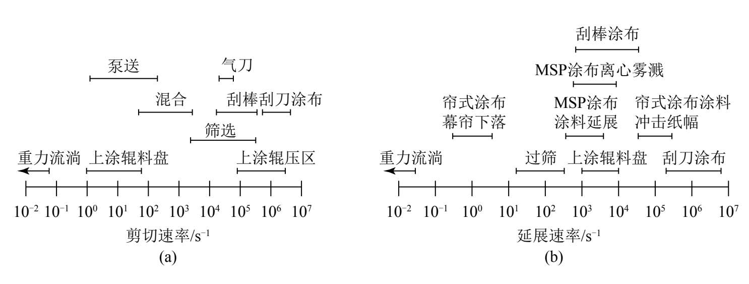 图 2-7 表明,在备料阶段、涂布阶段及计量阶段,涂布液经历剪切和延展速率的变化范围很大。对于帘式涂布而言,涂布液在与纸幅的冲击区所经历的延展速率,远大于幕帘自由下落时的延展速率,这是涂布液在冲击区更容易被拉断的原因;刮棒涂布和MSP涂布中涂布液所经历的延展速率范围大体相同;刮刀涂布中,涂布液经历的延展速率范围最大,最高达 10 7 s-1。