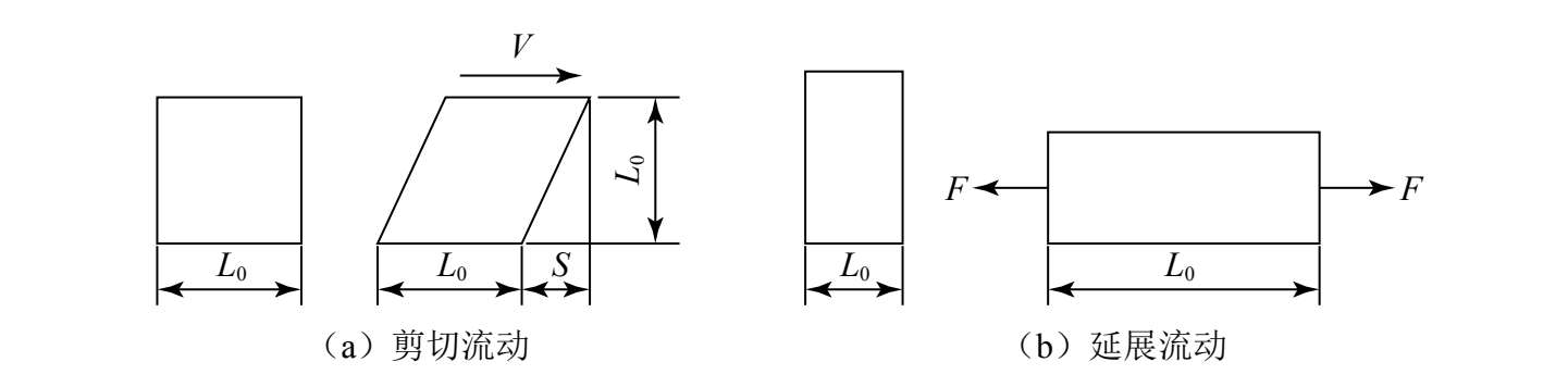 剪切流动和延展流动是涂布过程中普遍存在的流动形式,延展黏度的定义方式与剪切黏度类似,见图 2-6。在剪切流动中,涂布液的流动方向与受剪切应力所产生的速度梯度方向垂直,而在延展流动中,涂布液的流动方向和受延展应力所产生的速度梯度方向平行。