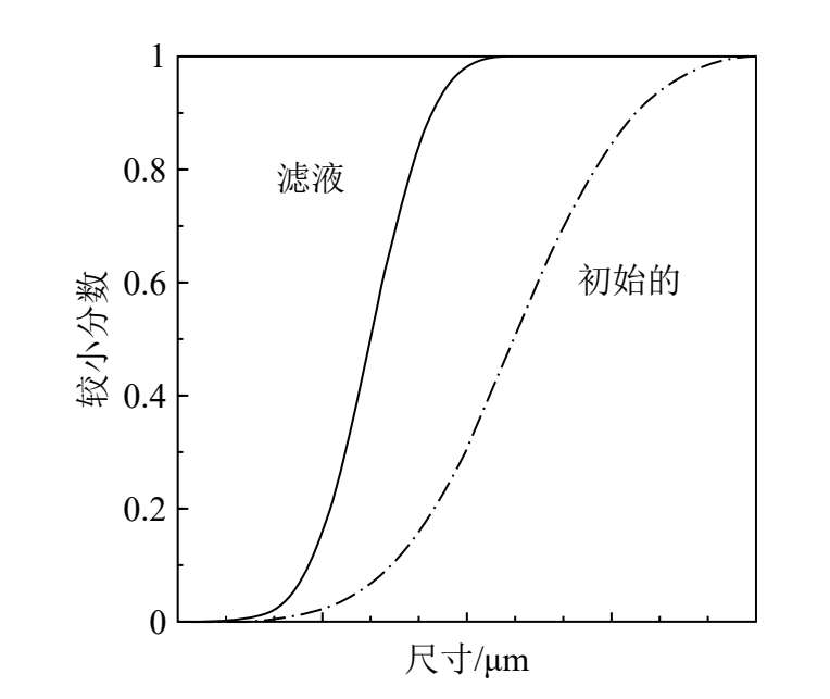 深层过滤器通常由以特殊图案缠绕在中心纤芯上的细丝组成(图 2-2)。进入孔隙的粒子可能会在改变方向之前撞击细丝,粘在细丝上除去。如果粒子穿过表面开口,仍有更多机会撞击内部细丝并黏附在其上。因此,会捕获一些小颗粒,而一些大颗粒可能会通过。例如,如果初始材料具有如图 2-3 所示的粒径分布,基本上所有大于特定尺寸的颗粒都将除去,大多数小颗粒仍然保留。保留在过滤器中的颗粒比例,随尺寸增加而增加。