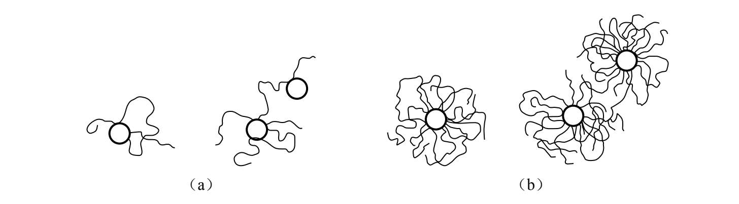 (a)低浓度聚合物将颗粒连接在一起,容易导致团聚;(b)高浓度聚合物将颗粒隔开,防止聚集