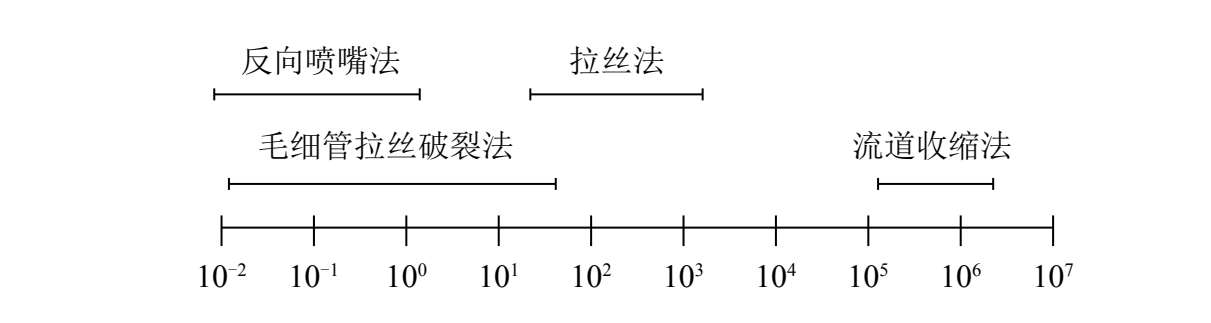 延展黏度的测量方法有拉丝法、反向喷嘴法、纺丝法、毛细管拉丝破裂法和流道收缩法等。不同的测量方法基于不同的假说和理论,测量也不尽相同(图 2-12)。拉丝法虽然可以直接测定延展黏度,但仅适用于高黏度聚合物熔融体,其他方法虽然可以测定低黏度流体,但形变速率均较低,只有流道收缩法可以达到实际涂布中的形变速率,造纸涂布液常用的是流道收缩法和毛细管拉丝破裂法。