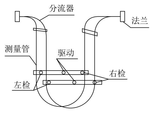 科里奥利是真正的质量流量计,由传感器和变送器两大部分组成。其中传感器用于流量信号的检测,主要由分流器、测量管、驱动、检测线圈、检测磁钢构成(图 2-15)。变送器用于传感器的驱动和流量检测信号的转换、运算及流量显示、信号输出,变送器主要由电源、驱动、检测、显示等部分电路组成。