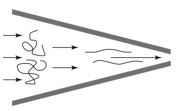 在涂布计量和转移过程中,不仅存在剪切流动,也存在显著的延展(拉伸)流动。延展流动是每当几何路径发生收敛或扩张时,涂布液在流动方向上受到加速作用,使分子链在其运动方向上受到拉伸的过程(图 2-5)。在刮刀计量过程中,辊式涂布器的压区出口以及帘式涂布涂布液跟随纸幅运动的过程中,涂布液均会经历延展流动。在抵抗拉伸形变的过程中,涂布液自身所产生的内部阻力,可用延展黏度来衡量,延展黏度大的涂布液表现出更高的抗拉伸能力,在MSP涂布中,尤其是在帘式涂布过程中可以提供更稳定的运行性能。