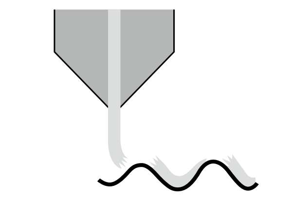 在落帘涂布中,涂布液在形成区、流动区以及冲击区,均会经历延展流动。在形成区和稳定区,涂布液所受延展形变较小,幕帘的稳定性主要由涂布液的表面张力决定,在幕帘冲击区,涂布液会经历显著的加速流动,延展速率将达到10 5 s -1 以上,延展流动和剪切流动共同影响涂布液的流变行为。如果涂布液的延展性能不好,很容易在冲击区被高速纸幅过分拉伸,甚至被拉断。这样,不仅影响落帘涂布的正常运行(图 2-10),还会造成涂层的表面缺陷和斑点 (图 2-11)。