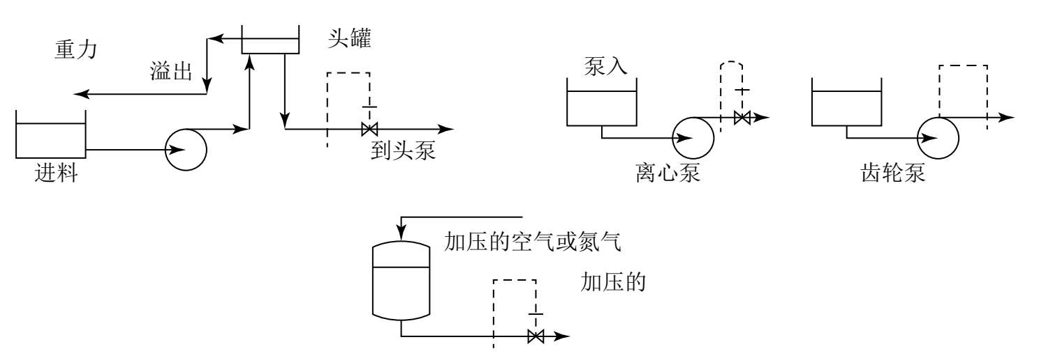 将液体用泵送到高位槽中,再通过溢流返回进料槽。压头箱可在管路中提供恒定的压头或压力,使流量控制(通过虚线连接至控制阀的流量计象征性表示)相对容易,系统无脉动。这种方式已不多见。