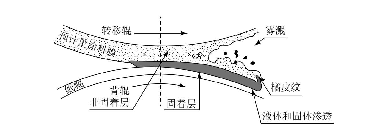 在MSP涂布中,非常薄的计量涂布液薄膜先被涂到转移辊上,然后通过两根互相反转的辊子压区将涂布液膜转移到纸幅上。涂布液膜在转移压区的分离非常重要,它不仅影响转移率和涂布量,还可能形成雾溅和橘皮纹,引起运行问题。雾溅是涂布液膜在转移压区分离时形成的(图 2-9),被认为是MSP涂布在高速生产时使用受限的原因,雾溅现象浪费生产原料,使操作变得困难,影响纸张质量。