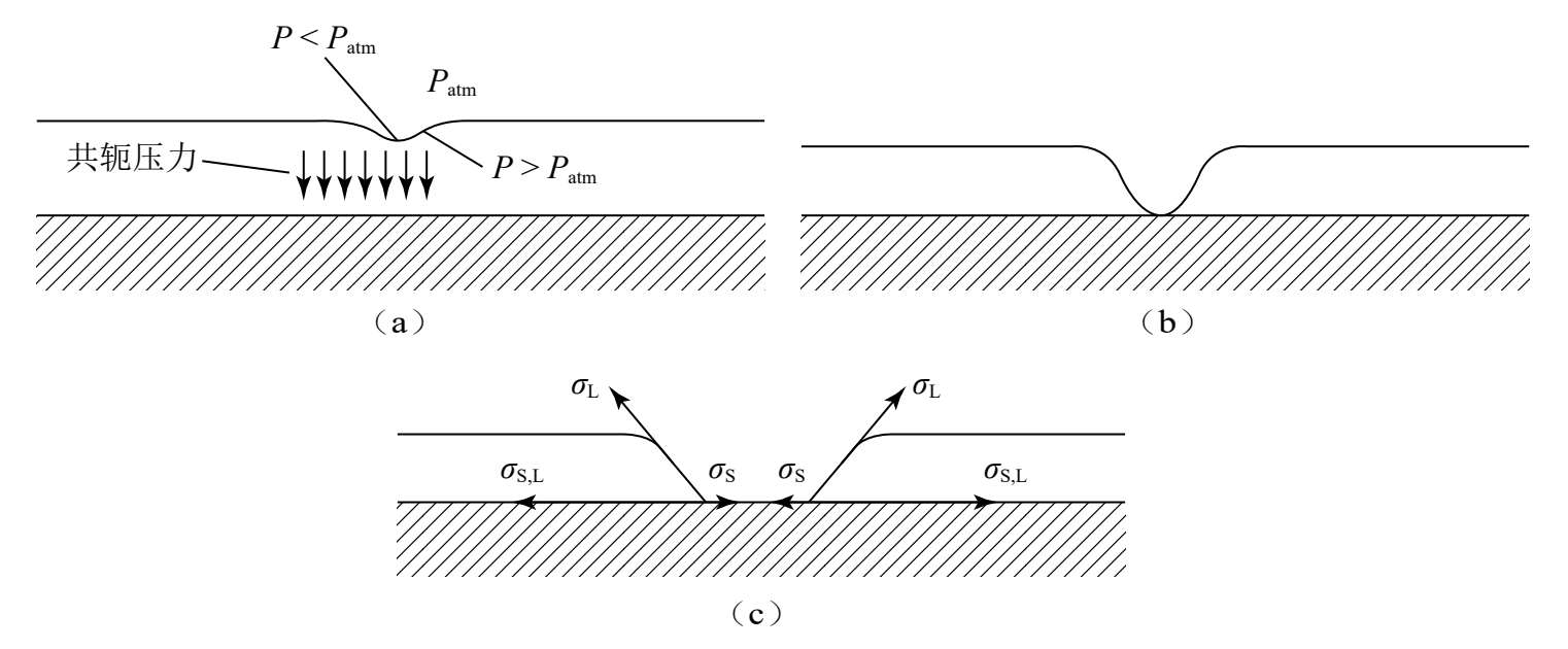 (a)表面力趋于规避凹陷,而组合作用力趋于放大凹陷;(b)组合作用力会在涂层中形成孔;(c)表面力会导致系统反向润湿