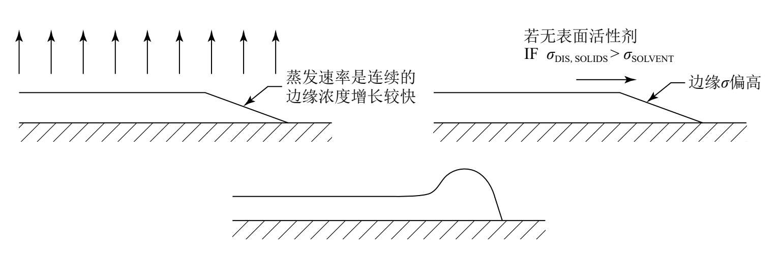 厚边也称为相框(图 2-20)。一般认为,在均匀干燥条件下,整个涂层会匀速蒸发。由于涂层边缘较薄,干燥过程中,边缘处的固体浓度将比分散状态的固体浓度更快提升。溶解的固体表面张力通常高于溶剂的表面张力,当无表面活性剂时,较高的固体浓度下的表面张力会更高。边缘处较高的表面张力,将导致涂布液流向边缘使其变厚。