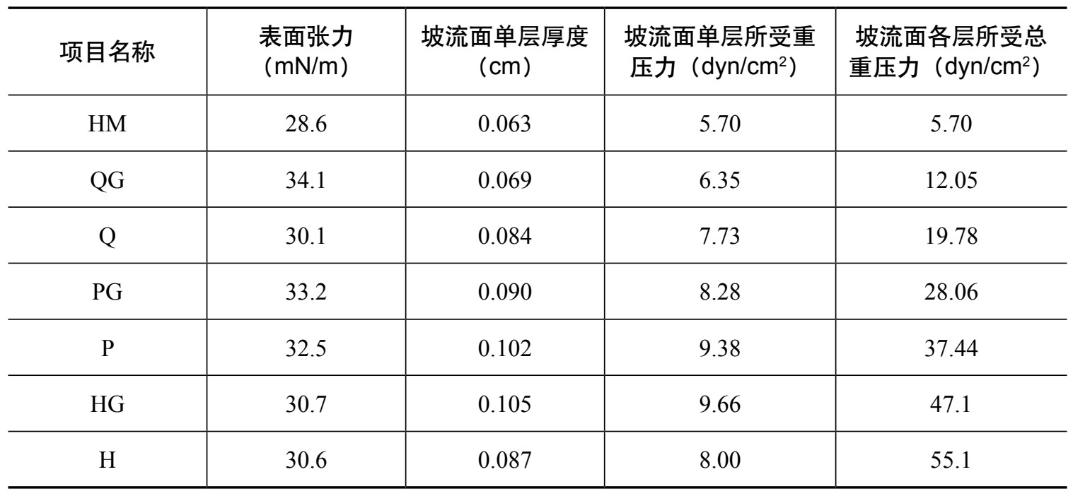 为了便于分析,取某型号彩纸涂布液上 4 层,在Agfa片环涂布机进行白灯实验,涂布条件为:涂布间隙为 80μm,涂布车速为 30m/min,涂布量和某型号彩纸涂布条件相同,则液膜在液桥的表面龄为 0.32ms左右。涂布时发现Q+QG层在坡流面上缩边现象明显。从涂布生片看,大面上无明显缺陷,只有因QG收缩引起的片边条道,但白灯显影发现,样片表面有麻点弊病。这些表面麻点弊病来自哪里?从涂布过程分析,涂布液从涂布缝隙流出并沿着坡流面往下流,由于金属的表面自由能很高(500 ~ 5 000mN/m),涂布液的表面张力为 28 ~ 35mN/m,所以液膜在坡流面上应该是润湿的。表 2-3 列出了某机实际匹配情况,并用斯托克斯方程计算坡流面上各层液膜的单层厚度及各层液膜所受总压力。