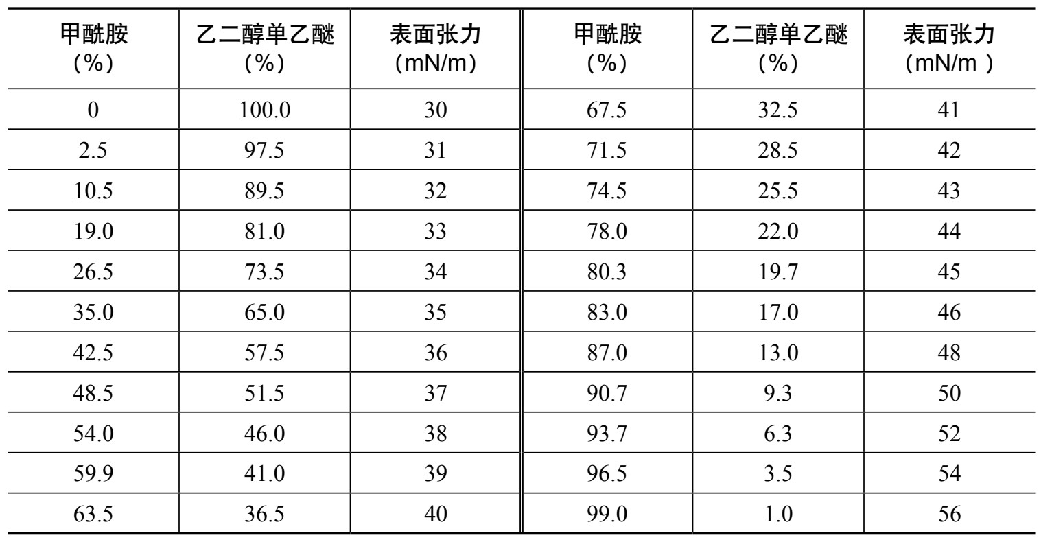表2-2 甲酰胺—乙二醇单乙醚混合溶剂的表面张力