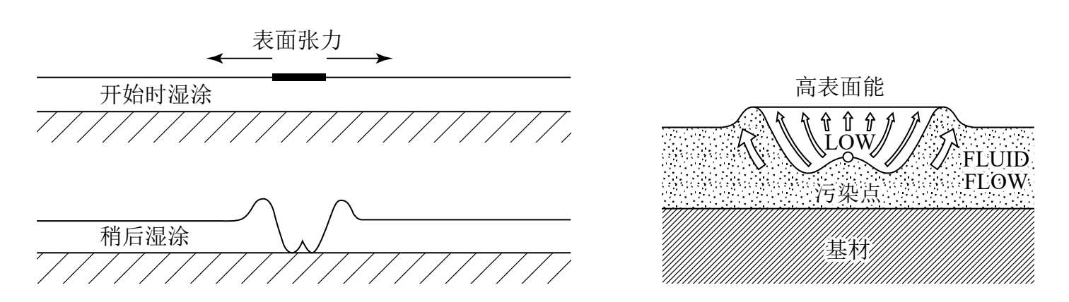涂布液的低表面张力和基材的高表面能,是良好润湿铺展的基础。否则,涂层可能会润湿不良而反润湿,即涂布液从涂布区域缩回(图 2-22)。当这种情况在大范围内发生时,称为爬网。当基材因受到污染(如由于油滴)而具有较低的表面能时,可能发生反润湿。