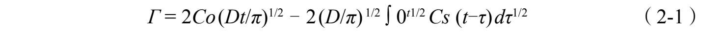 式(2-1)中,Co是主体浓度,Cs是亚表面浓度,D是扩散系数m 2 /s,t是表面龄,π是圆周率,τ是辅助变量。方程(2-1)右端第一项,代表表面活性剂从内部扩散到亚表面。在建立表面的瞬间,亚表面浓度和吸附密度近似等于 0。当吸附显著时,扩散从亚表面向溶液内部进行反扩散,由(2-1)式第二项表示。当表面吸附达到饱和就建立了动态的吸附平衡,动态表面张力就接近静态表面张力。