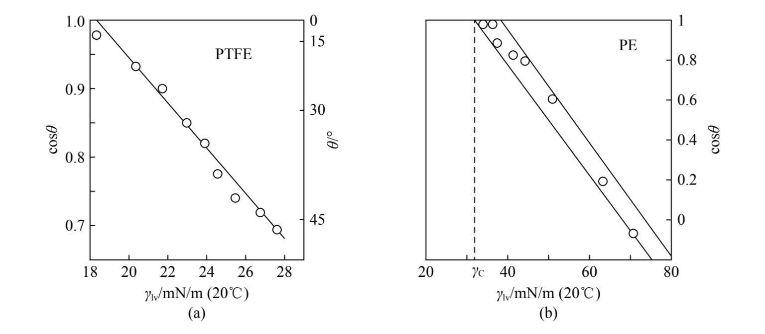 (a)正烷烃同系物测量聚四氟乙烯(PTFE)的Zisman图;(b)用非同系物测量聚乙烯(PE)的Zisman图