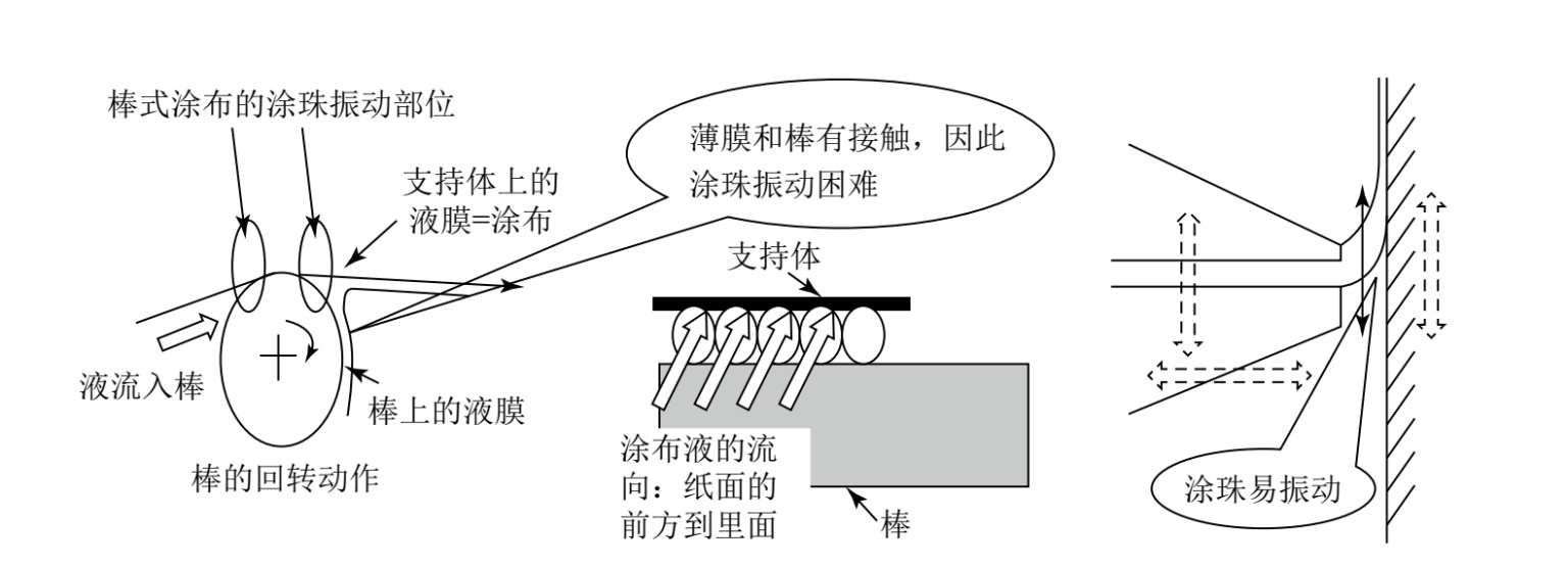搬运过程不规范,机械基础、压缩机、冷冻机、风扇等的振动,以及配管振动引起的机械振动,都会导致狭缝式挤压涂布涂珠振动。刮棒涂布也有诸多因素影响涂珠振动,导致涂布不匀(图 1-4)。