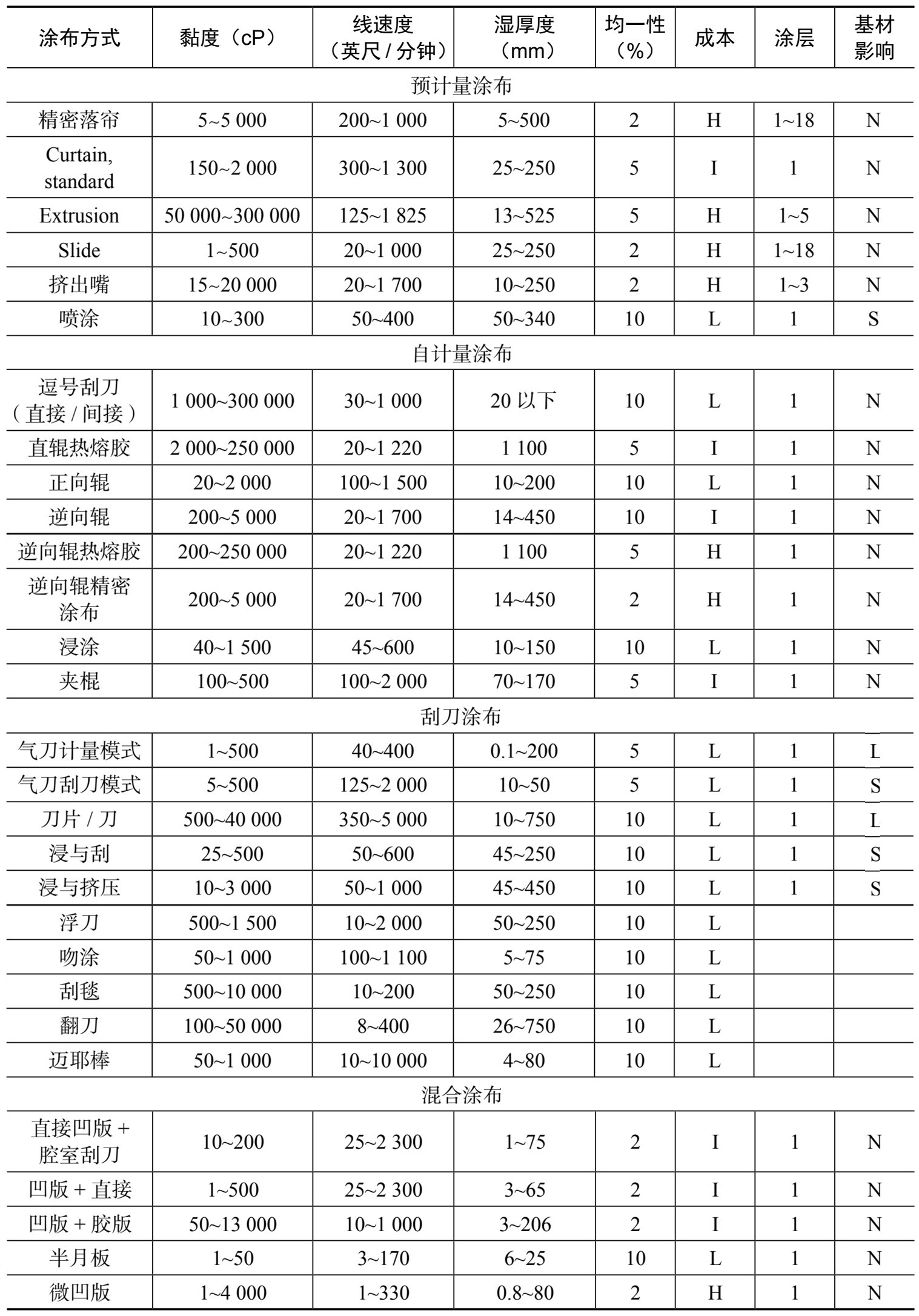 不同涂布方式,在涂布液黏度、可实现的涂布速度及涂布厚度、涂布均一性和一次涂层数量及涂布基材的影响方面,各不相同(表 1-1)。