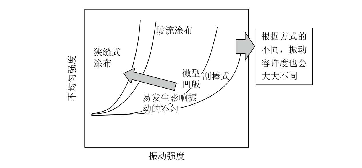 机械振动对不同方式涂布不匀的影响不同(图 1-3)。允许的振动强度,可以涂珠(根据频率、涂布液而变化)范围表征。模头挤压涂布对各种振动都非常敏感,易发生缺陷。