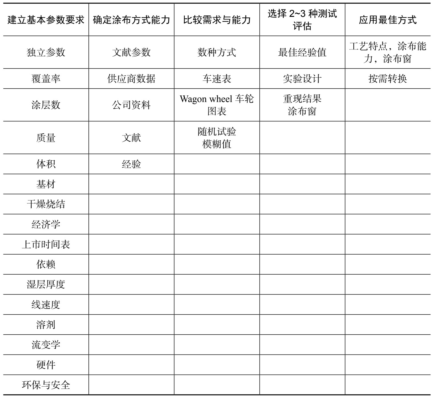 为此,需要双方对建生产线以及涂布技术要有很好的把握,才能结合实际评估交流,选定涂布方式。表 1-2 是最优化涂布方式选择的参考途径。