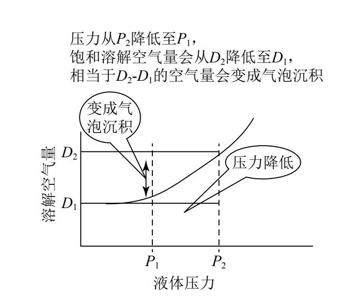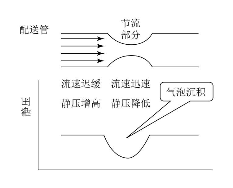 当液体流动时,液体内部因压力差,短时间内会有气泡发生和消失的现象,这些会发生在泵、配送管、涂布头等处。即接触物在流体高速移动时生成气泡,也可认为是形成负压的现象。在设备内部、压力降低时,无法溶解的空气会变成气泡释放,如图 1-10 所示。