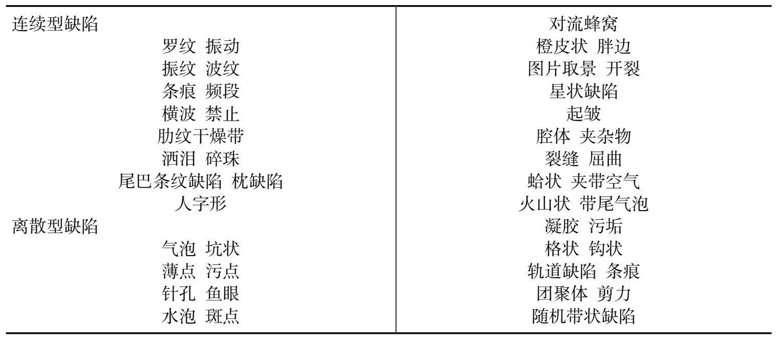 检测到缺陷后,通常由第一位观察者为其指定一个描述缺陷的名称。中心清晰的圆形缺陷,看起来像是在中心出现气泡,则称为气泡,带有中心的斑点称为污垢,横向标记称为振颤,涂层中的柔软不均匀斑点。在汽车饰面的喷涂层中,尽管名称不同,但针孔和微泡都描述了相同的缺陷。在涂布和干燥缺陷中,很少有测试可以定量地定义物理不均匀性,如气泡或条纹,并且由于涂布样品性能多样,如颜色、硬度、涂布量、照相胶片的感光度,对应着各种缺陷名称。此外,许多来源相同的缺陷,如振颤和条纹,两者都涉及来自不同原因的多种缺陷。表 1-9中总结了一些广泛使用的缺陷通用名。这些名称来自研讨会上论文、专利文献、出版物及涂布和干燥领域的从业人员。