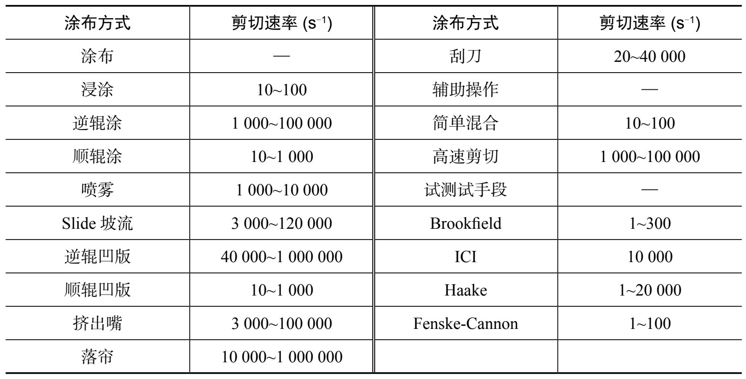 涂布液必须以过程中将要经受的剪切速率来表征,单点低剪切速率黏度计,变化的涂布过程组件的剪切速率范围很广,不适用于涂布过程。在较高的剪切速率下,黏度行为可能有很大不同。表 1-8 展示了不同涂布工艺过程的剪切速率;浸涂的剪切速率仅为 10 ~ 100s-1,而逆辊凹版涂布为 40 000 ~ 1 000 000s-1。