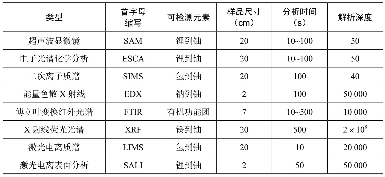 有四类基本的分析仪器,可以快速提供基本表征数据:具有数字图像分析功能的光学视频显微镜(视频增强显微镜)、红外显微镜、扫描电子显微镜(SEM)和能量色散X射线(EDX),以及电子光谱化学分析(ESCA)。