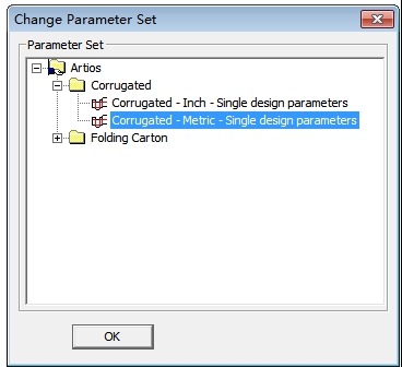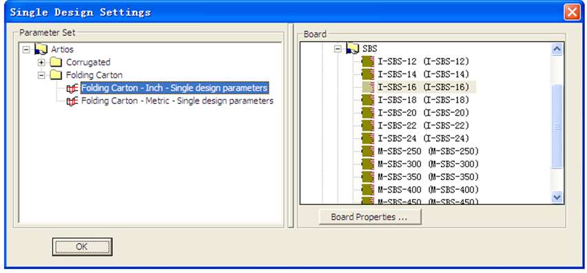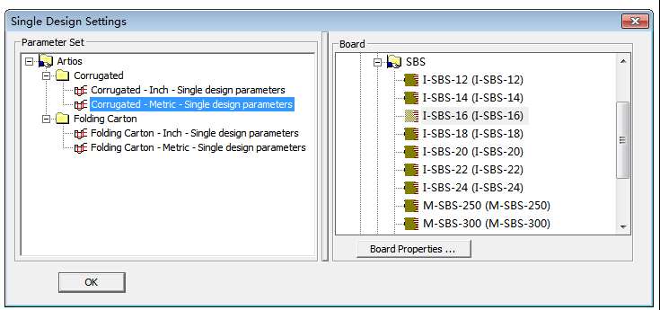 2.单击菜单栏File> New Design,打开Single Design Settings对话框,在此对话框中含有一个可用参数组和纸板列表。通过选择参数组(Parameter Set),可设置符合设计的面朝向和瓦楞/颗粒方向,并选择桥接/切槽公式和流浆/涂层偏移量。纸板(Board)列表是一组设置,为ArtiosCAD提供制造用材料的各种信息,如纸板厚度、内部缩小、外部增大及公差,如图2-40所示。