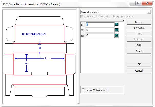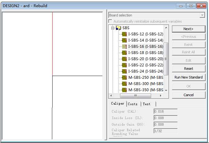 5.如要更换纸板信息或对纸箱的尺寸进行重新设计,可单击菜单栏Design>Rebuild Design,打开Rebuild对话框,单击Previous,可更改纸板的信息。单击Next,可对纸箱的尺寸进行重新设计,如图2-43~图2-44所示。如需其他设计,可单击菜单栏Info> Board Information,打开Board Information对话框,在此可以对纸板信息进行修改,如图2-45~图2-46所示。