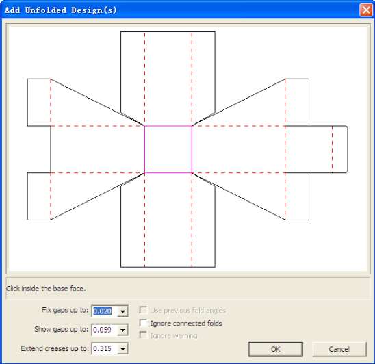 3.开启“Add Unfolded Design(s)”对话框。此时系统会提醒,将其中一块纸板选定为基本面。若已显示且已选定,则取消勾选Use previous fold angles,单击OK,如图3-4所示。