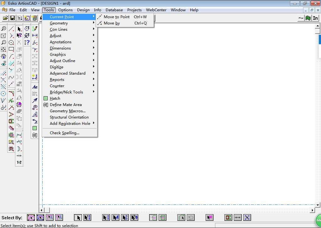 在ArtiosCAD中,鼠标的移动需依靠抬笔工具。其中抬笔工具分为移动至点(Move to Point)和按照……移动(Move by)。单击菜单栏Tools>Current Point,即可启用抬笔工具,如图2-3所示。抬笔工具分为以下两类。