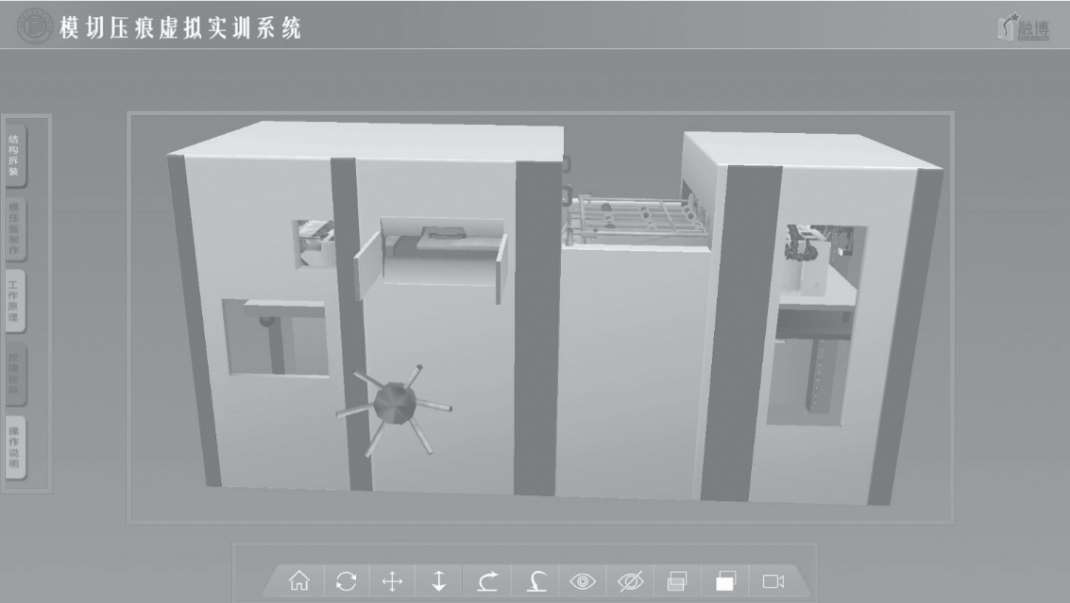模切压痕虚拟仿真实训系统主界面一共分为三个部分,分别为界面视图左侧的功能模块区、中间的模型操作区、下方的工具按钮区,具体位置如图1-6所示。