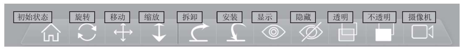 在模切压痕虚拟实训系统中,工具按钮区是功能操作的执行按钮。工具按钮区总共有初始状态、旋转、移动、缩放、拆卸、安装、显示、隐藏、透明、不透明、摄影机共11个功能按钮,如图1-7所示。每个功能按钮都可以实现相应的功能操作,当移动感应触控笔到功能按钮上方时,功能按钮显示该按钮的功能,说明此时该按钮可使用,否则不可使用。