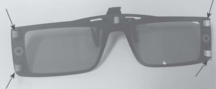 MR眼镜采用了先进的“时分法”原理,将眼镜信息与显示器信号进行同步。操作者佩戴眼镜后,坐在机器正前方,眼镜和显示器之间不能有障碍物遮挡,主机通过捕捉眼镜上的四个点,如图1-3所示,实现头部信息的捕捉。当摆动头部位置时,主机捕捉头部位置信息,完成上下左右前后六个视角的场景位移变化。