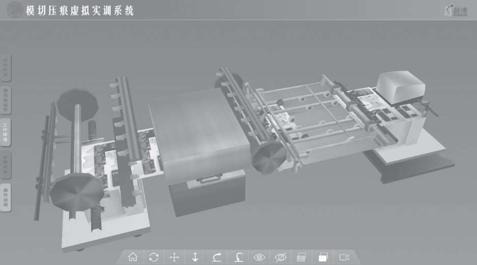 模切压痕设备开始工作后,给纸装置上的分纸吹嘴和压纸脚对纸堆上的纸张进行分离,分离后的纸张被递纸吸嘴输送给接纸辊,接纸辊接过纸张,通过输纸板台,输送到前规处进行定位,输纸板台上的双张检测器和侧规对纸张的厚度和位置进行检测,保障纸张顺利输送到前规处。输纸链条上的叼牙咬住前规处的纸张咬口,将纸张输送到模压单元下方,模压单元上下运动,对纸张进行模切和压痕,模压完成后的纸张被输纸链条输送到收纸台上方。收纸台上的齐纸装置对纸张进行齐纸,输纸链条返回,开始下一个循环工作。整个模切压痕设备工作过程以动画的形式呈现纸张从分离到输送、定位、模压、收纸等一系列的模切压痕工作的动作,操作者配合工具按钮,可进行内部观察,进行模切压痕的细致探究。