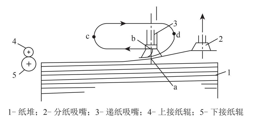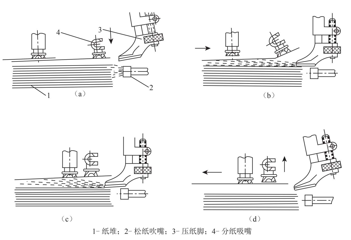 分纸吸嘴的主要功能是:当松纸吹嘴吹松纸堆上方的纸张,分纸吸嘴向下移动,吸住最上面的一张纸,上抬并后翘,以防止吸住双张,并有利于压纸脚插入纸张下方。分纸吸嘴吸起薄纸的高度为6~8mm左右,厚纸的高度为2~3mm左右。分纸吸嘴的运动示意图如图1-9所示。