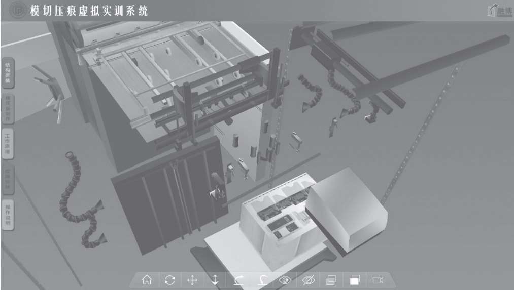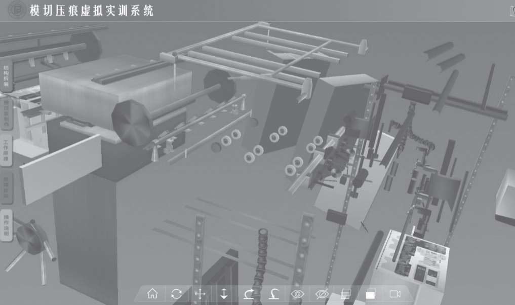 模切压痕设备开始工作后,给纸装置上的分纸吹嘴和压纸脚对纸堆上的纸张进行分离,分离后的纸张被递纸吸嘴输送给接纸辊,接纸辊接过纸张,通过输纸板台,输送到前规处进行定位,输纸板台上的双张检测器和侧规对纸张的厚度和位置进行检测,保障纸张顺利输送到前规处。输纸链条上的叼牙咬住前规处的纸张咬口,将纸张输送到模压单元下方,模压单元上下运动,对纸张进行模切和压痕,模压完成后的纸张被输纸链条输送到收纸台上方。收纸台上的齐纸装置对纸张进行齐纸,输纸链条返回,开始下一个循环工作。整个模切压痕设备工作过程以动画的形式呈现纸张从分离到输送、定位、模压、收纸等一系列的模切压痕工作的动作,操作者配合工具按钮,可进行内部观察,进行模切压痕的细致探究。