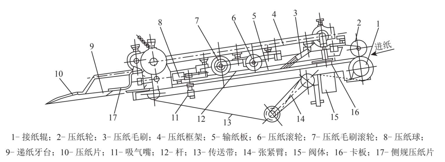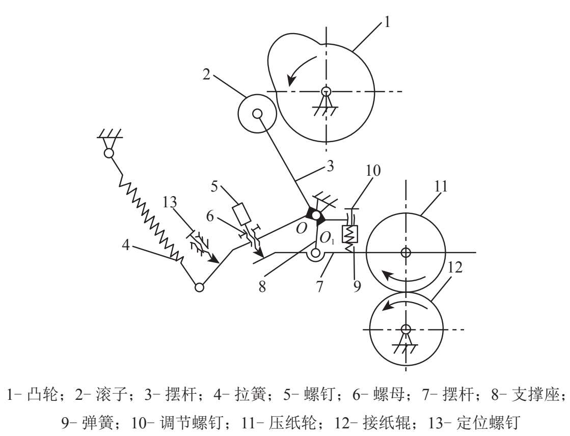 接纸压轮机构由接纸辊、压纸轮、凸轮、摆杆等组成。其主要功能为:当给纸装置将纸张分离出来时,接纸辊和压纸轮相互配合,将递纸吸嘴递送给接纸辊的纸张以一定速度向前输送给输纸台,形成一定的输纸步距。接纸压轮机构示意图如图1-13所示。